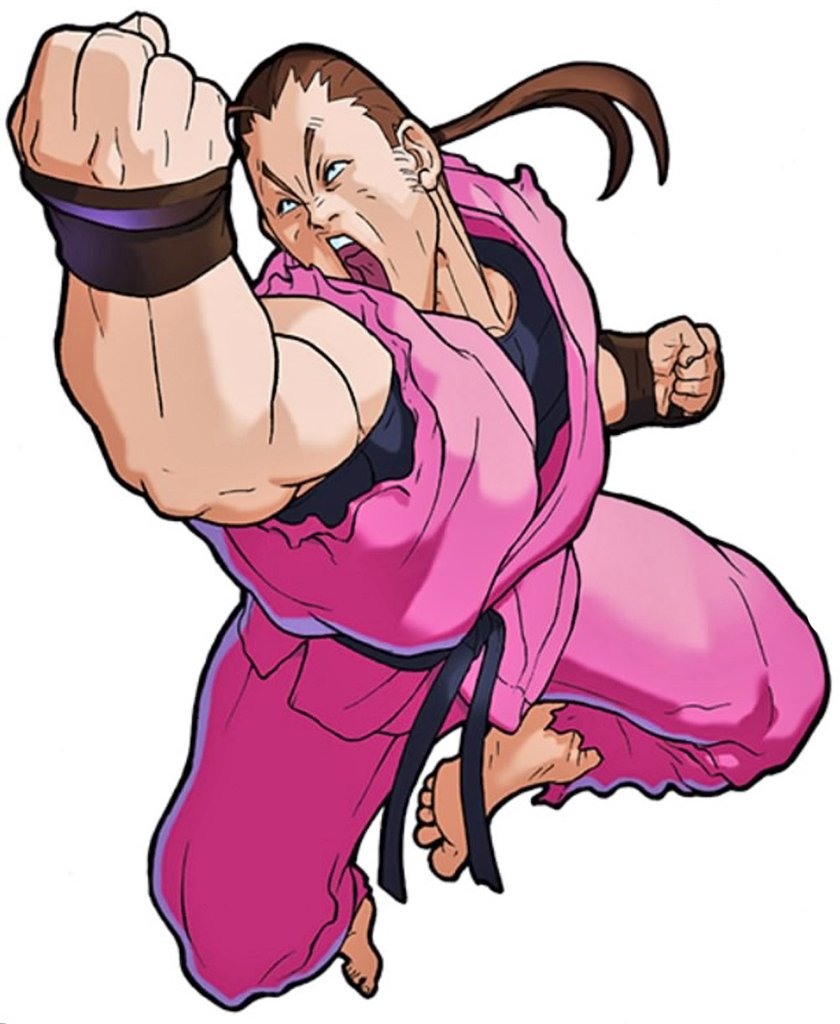 Dan has a similar outfit to Ryu and Ken, wearing a traditional Karate gi, but pink (a color combination of Ryu and Ken's gi). Dan also wears a black undershirt, which later covered his shoulder as of Street Fighter IV. His head and face closely resembles Robert from Art of Fighting.